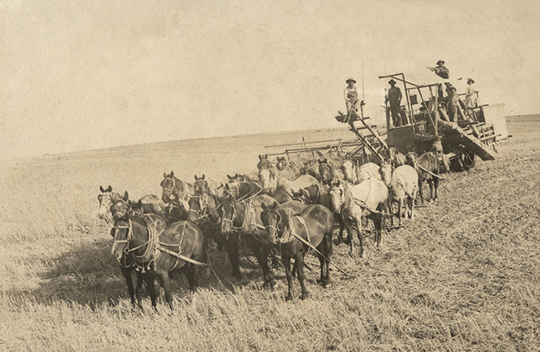 A combine pulled by the famous McCutchen horses, brought originally from the homeplace in Yacolt. The most famous of the horses were the sorrels (a beautiful red-brown). Notice that these horses are not the big heavy animals one often equates with draft horses. McCutchen horses could be used for saddle or work horses. Combines were often pulled by as many as 32 horses and/or mules. The people here are the McCutchen brothers, (probably Bill, George, Ed and someone else) and one of their wives.