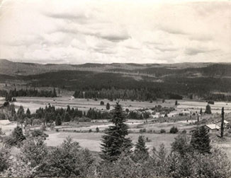 Can you identify the McCutchen barn? It is the white spot a bit to the left of center. Notice the timber growth in the background and the burned areas that still show from the 1929 burn. This photo was taken in about 1946 while I was living there. |