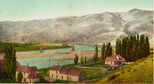 An old postcard of the Snake River bridge between Lewiston Idaho and what became Clarkston, Washington. This is probably about what it looked like when the McCutchens were here. The Lewiston valley was usually 10 degrees warmer than the surounding area and was called the "Banana Belt". In the 1950's I lived on a wheat ranch on a mesa on top of hills like those in the distance but on the Washington side. (Postcard sold by Moody's Collectables ) |